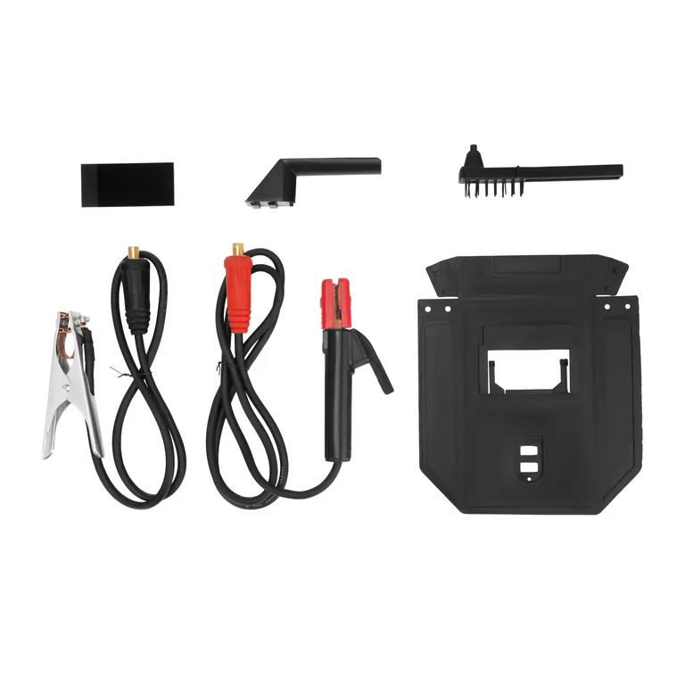 کابل و گیره اتصال به زمین(۲متر)_کابل الکترود(۱/۸ متر)_چکش برس دار_ماسک و شیشه_انبر جوشکاری